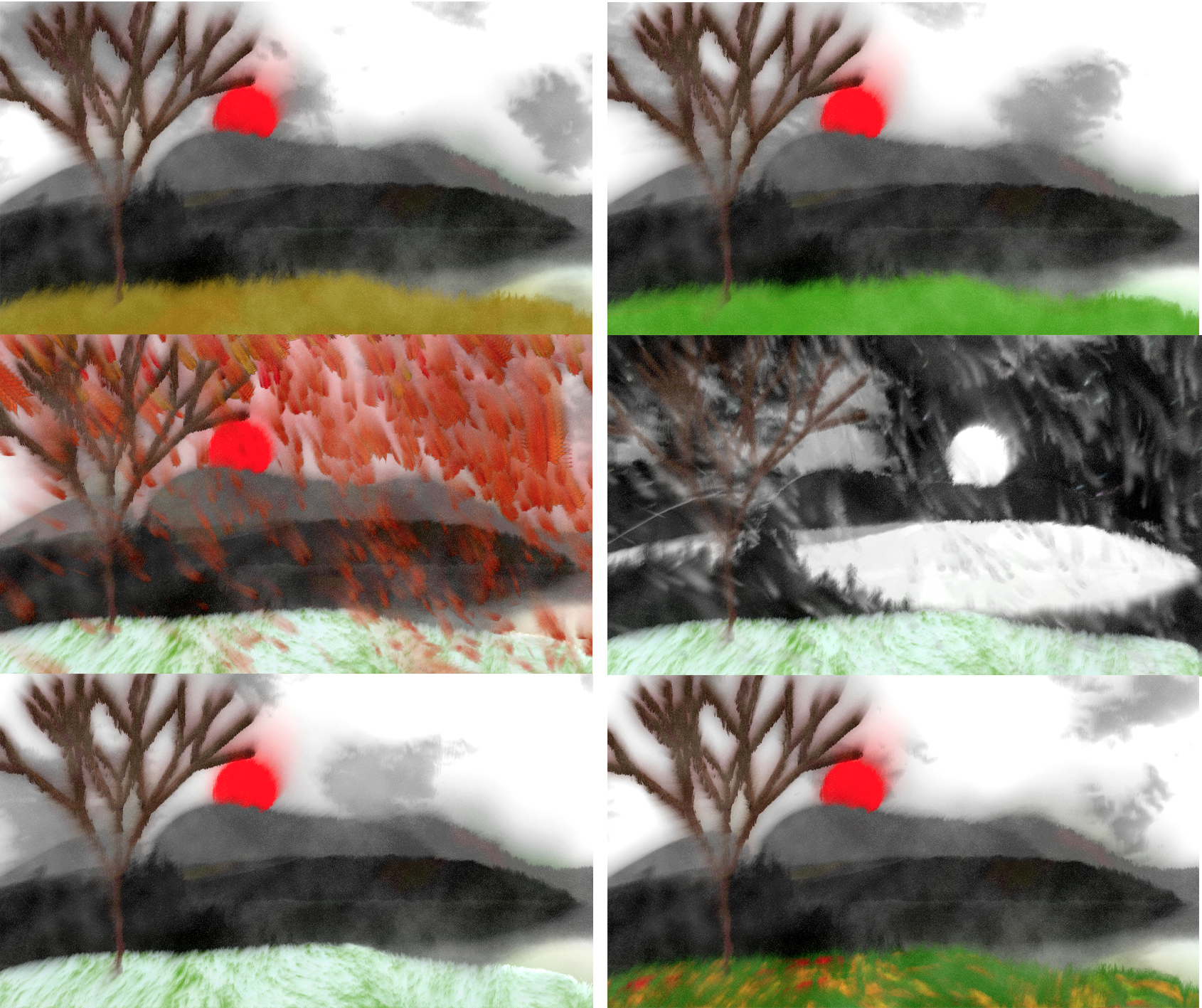 La composition du paysage est entièrement modulable : montagnes, arbres, rivières et îles peuvent être reconfigurés dynamiquement. Le cycle jour/nuit, le cycle lunaire et un cycle saisonnier évoluent de manière autonome, en fonction du temps réel.